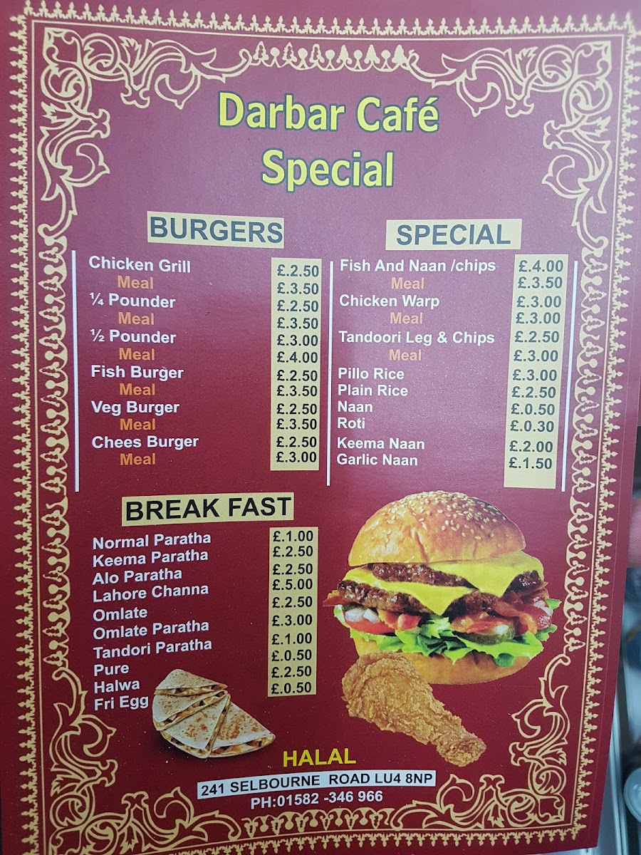 Nestled in the heart of Luton, the New Darbar Cafe offers an authentic culinary experience that celebrates Desi cuisine. The menu features a variety of vegetarian delights, including the rich Palak Paneer and comforting Chana Daal, each priced at just £6.50. For those craving a hearty meal, the cafe's chicken selection is equally enticing, with options starting at a mere £1.80 for a single piece and various meal combos available.